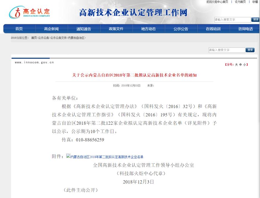 在全体员工的共同努力下,我司于2018年11月底通过内蒙古自治区2018年高新技术企业认定,于2018年12月3日在 高新技术企业认定管理工作网上公示。